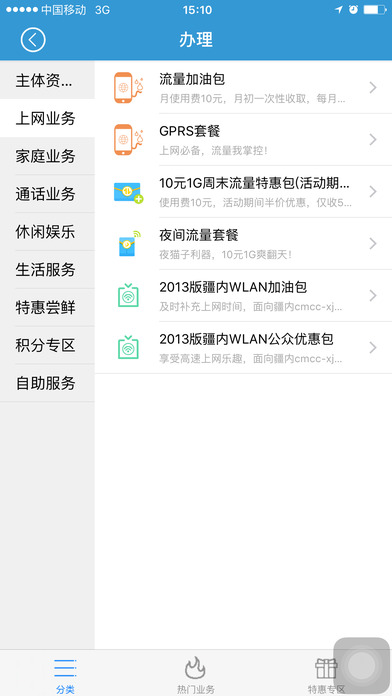 2) 办理服务:全球通统一资费套餐、增值数据业务、WLAN套餐流量、移动数据流量套餐等业务办理