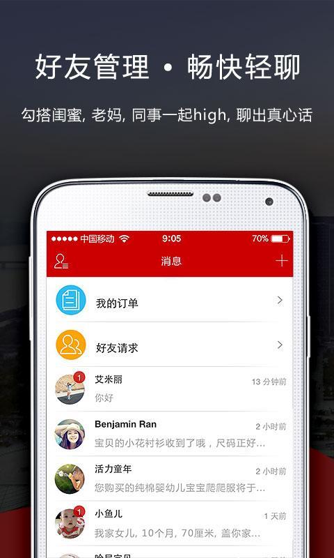 消息:提醒用户交易状况,订单进程查询,订单详情查询,更新订单状态,添加好友,组建讨论组,便捷轻聊功能。