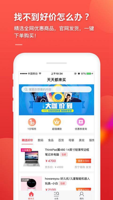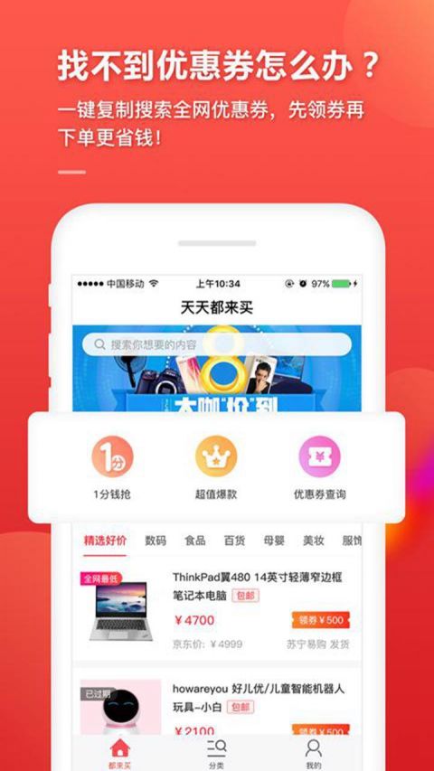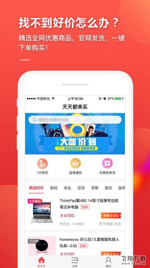 天天都来买安卓版是一款非常好用的优惠购物手机软件,全网精品好货每日更新,看到中意的商品,打开app一键复制粘贴就能立刻搜索优惠券,领完劵再购物,买到就是省到,有需要的用户快来52z飞翔下载站下载试试吧!